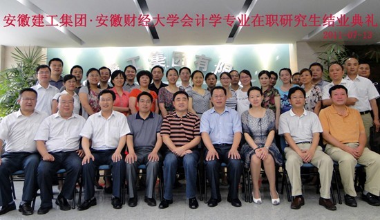 2011年07月13日上午,安徽建工集團•安徽財經(jīng)大學(xué)會(huì )計學(xué)專(zhuān)業(yè)在職研究生課程進(jìn)修班結業(yè)典禮,在我集團公司三樓會(huì )議室隆重舉行。