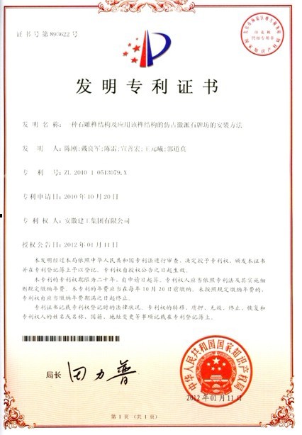 安徽建工集團有限公司申報的“一種石雕榫結構及應用該榫結構的仿古徽派石牌坊的安裝方法”通過(guò)了國家知識產(chǎn)權局最終審核,并于近日收到了“發(fā)明專(zhuān)利證書(shū)”(專(zhuān)利號:ZL 2010 1 0513079.X)。該發(fā)明專(zhuān)利自國家知識產(chǎn)權局2012年1月11日授權之日起,專(zhuān)利權期限為20年。