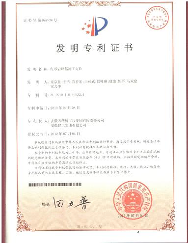 同時(shí),集團公司與路橋集團聯(lián)合研發(fā)的“紅砂巖路基施工方法”也于當日獲得發(fā)明專(zhuān)利授權(專(zhuān)利號:ZL 2010 1 0140922.4)。