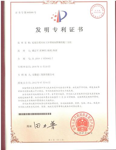 2012年7月4日,由安徽建工集團有限公司自主研發(fā)的“陡坡巖質(zhì)河床上異型深水圍堰的施工方法” 獲得國家知識產(chǎn)權局發(fā)明專(zhuān)利授權(專(zhuān)利號:ZL 2010 1 0556962.7)。