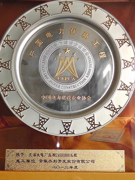 安徽水利股份開(kāi)發(fā)公司承建項目蕪湖發(fā)電廠(chǎng)榮獲“中國電力優(yōu)質(zhì)工程獎”