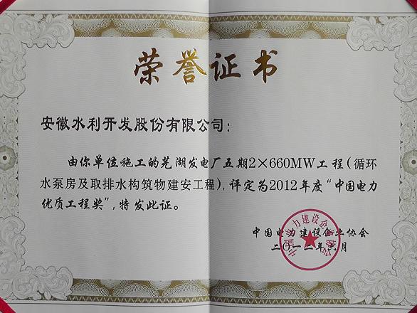 近日,安徽水利再添新榮譽(yù),由安徽水利承建的蕪湖發(fā)電廠(chǎng)五期2×660MW工程(循環(huán)水泵房及取排水構筑物建安工程)經(jīng)中國電力建設企業(yè)協(xié)會(huì )考評研究,被授予2012年度“中國電力優(yōu)質(zhì)工程獎”。