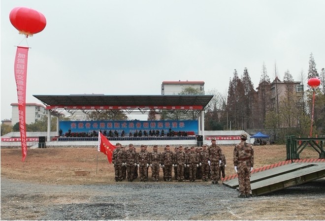 此次演示是全省交通戰備工作會(huì )議的一項重要內容,旨在貫徹交通戰備工作“平時(shí)服務(wù)、急時(shí)應急、戰時(shí)應戰”總要求。演練模擬情景是合肥地區某路遭受連續強降雨,誘發(fā)滑坡,造成原橋梁垮塌,道路中斷。在省交戰辦和建工集團戰備辦的統一領(lǐng)導下,省路橋公司公路工程保障中隊迅速行動(dòng),高舉旗幟,齊喊口號,跑步進(jìn)入現場(chǎng),開(kāi)始架設,在架設的同時(shí),進(jìn)行了現場(chǎng)同期聲解說(shuō),隊員們分工明確,技術(shù)熟練,配合默契,用最短的時(shí)間架設一座跨徑33米的“321”式公路戰備鋼橋。隊員們在沒(méi)有機械設備的情況下,依靠人工肩扛手抬,迅速完成了桁架、橋面板等搭設,將鋼橋推過(guò)河,隨后三輛炮車(chē)緩緩通過(guò),進(jìn)行裝備通載檢驗。至此,戰備鋼橋架設演示圓滿(mǎn)完成。演示活動(dòng)結束后,領(lǐng)導們上橋檢閱,親切地接見(jiàn)、慰問(wèn)了參演隊員,并合影留念。