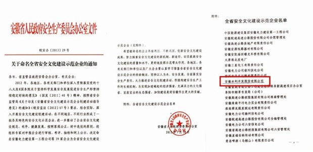2013年7月31日,從安徽省安全生產(chǎn)委員會(huì )辦公室召開(kāi)的表彰大會(huì )上傳來(lái)喜訊,安徽水利被命名為“安徽省安全文化建設示范企業(yè)”,成為全省被命名的39家企業(yè)為之一。