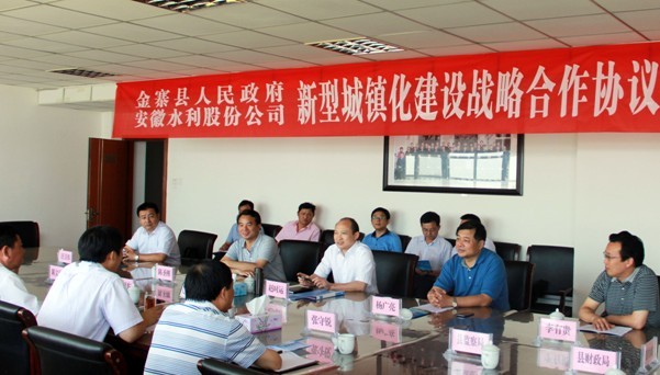 2013年8月1日上午,安徽水利與金寨縣人民政府在金寨縣政府九樓會(huì )議室舉行簽約儀式,簽署《新型城鎮化建設戰略合作協(xié)議》,就金寨縣縣城及現代產(chǎn)業(yè)園區舊城改造、新區開(kāi)發(fā)、保障性住房、道路橋梁、河道治理等138億重點(diǎn)建設項目進(jìn)行投資合作。安徽水利總經(jīng)理楊廣亮和金寨縣常務(wù)副縣長(cháng)李衛東代表雙方簽約。六安市委常委、金寨縣委書(shū)記潘東旭、常務(wù)副縣長(cháng)李衛東,安徽建工集團黨委書(shū)記、董事長(cháng)、安徽水利董事長(cháng)趙時(shí)運,安徽建工集團董事、安徽水利總經(jīng)理楊廣亮,安徽水利常務(wù)副總經(jīng)理陳圣剛,安徽建工集團財務(wù)資產(chǎn)部主任李有貴、安徽路橋公司董事長(cháng)汪衛東等出席簽約儀式。