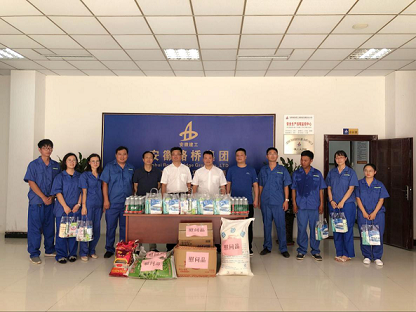 公司領(lǐng)導每到一處,都首先來(lái)到溫度最高,熱浪最強的一線(xiàn)施工現場(chǎng),雖然烈日當空,但是每到一處都會(huì )看到安徽路橋集團施工一線(xiàn)紅旗招展,機械轟鳴,一片大干繁忙景象,領(lǐng)導們每到一處,最先關(guān)心的就是正在作業(yè)的一線(xiàn)施工人員,向他們表示親切問(wèn)候,并親手將綠豆、糖、毛巾、洗發(fā)水、香皂等防暑降溫慰問(wèn)品以及藿香正氣口服液風(fēng)、油精、十滴水等防暑降溫藥品送到一線(xiàn)職工手中,叮囑項目管理人員要合理安排員工作息時(shí)間,采取有效防暑降溫措施,保證高溫作業(yè)條件下員工的身體健康。