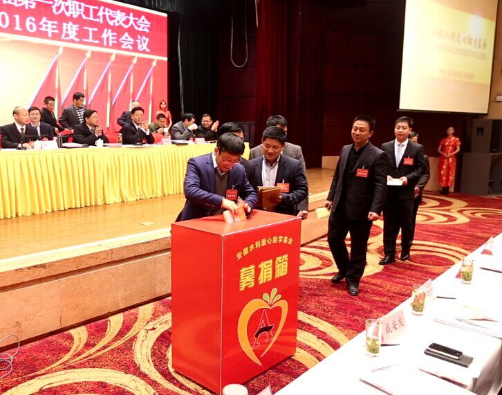 2016年3月4日上午,在安徽水利職代會(huì )上,舉行了“安徽水利愛(ài)心助學(xué)基金”第二次公開(kāi)募捐儀式。捐款現場(chǎng)播放了基金宣傳片,溫馨而感人,安徽水利員工紛紛慷慨解囊,共募得善款近14萬(wàn)元。