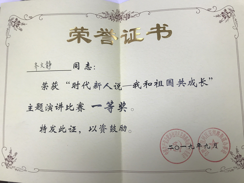 2019包河區蕪湖路街道“我與祖國共成長(cháng)”演講比賽第一名