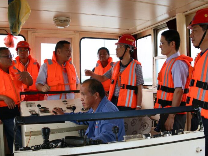 王厚良一行登上正在青弋江河道中進(jìn)行河道清淤的“蛟龍號”,查看施工作業(yè)進(jìn)度,指導安全度汛工作。他與船員們親切交談,詳細了解船舶施工中遇到的難點(diǎn)問(wèn)題,指導船員們在施工過(guò)程中應該注意的安全事項,囑咐安徽交航公司要做好船員的后勤保障工作。上岸后一行人又驅車(chē)趕往南陵縣四七圩倉溪段堤壩抗洪搶險第一線(xiàn),乘坐沖鋒舟,登上正在潰堤處進(jìn)行施工作業(yè)的抓斗船。王總一行詳細查看了船上作業(yè)設備,詢(xún)問(wèn)了施工進(jìn)度,囑咐大家在艱苦的水上作業(yè)同時(shí)要注意自身安全。王總還與在船上值守的南陵縣水務(wù)局負責人進(jìn)行了親切交談,對方再次感謝安徽建工、安徽交航對當地政府抗洪救災給予的大力支持。安徽交航職工紛紛表示將不辱使命,繼續發(fā)揚不怕苦不怕累的拼搏精神,爭取盡早完工,讓災民們早日返回家園。