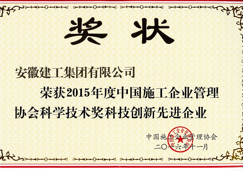 根據《中國施工企業(yè)管理協(xié)會(huì )科學(xué)技術(shù)獎評選管理辦法》的規定,經(jīng)省協(xié)會(huì )推薦、科委辦公室初審、專(zhuān)家網(wǎng)絡(luò )評審、專(zhuān)家委員會(huì )評審、科學(xué)技術(shù)委員會(huì )審定,中國施工企業(yè)管理協(xié)會(huì )做出《中國施工企業(yè)管理協(xié)會(huì )關(guān)于表彰2015年度科學(xué)技術(shù)獎的決定》(中施企協(xié)字﹝2016﹞68號),授予安徽建工集團等159家企業(yè)科技創(chuàng )新先進(jìn)企業(yè)獎。