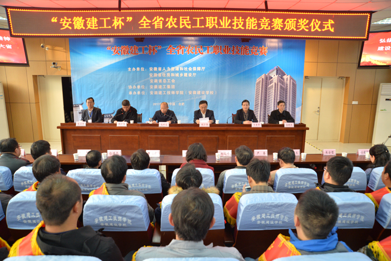 2017年11月25日,由安徽省人力資源和社會(huì )保障廳、安徽省住房和城鄉建設廳、安徽省總工會(huì )聯(lián)合舉辦,安徽建工集團協(xié)辦,安徽建工技師學(xué)院承辦的“安徽建工杯”全省農民工職業(yè)技能競賽在安徽建工技師學(xué)院隆重舉行。來(lái)自全省16個(gè)地市、2個(gè)省直管縣和安徽建工集團組成的19支代表隊共76名選手參加了砌筑工、抹灰工、鑲貼工3個(gè)職業(yè)(工種)的決賽。