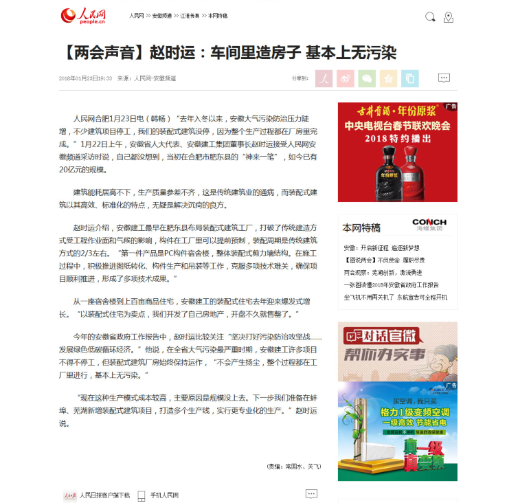 1月22日上午,安徽省第十三屆人民代表大會(huì )第一次會(huì )議在安徽大劇院隆重開(kāi)幕。省人大代表、省十三屆人大一次會(huì )議計劃和預算審查委員會(huì )委員,安徽建工集團董事長(cháng)、黨委書(shū)記趙時(shí)運出席會(huì )議。當天上午,趙時(shí)運代表現場(chǎng)就“堅決打好污染防治攻堅戰、推進(jìn)裝配式建筑”接受人民網(wǎng)安徽頻道記者采訪(fǎng)。