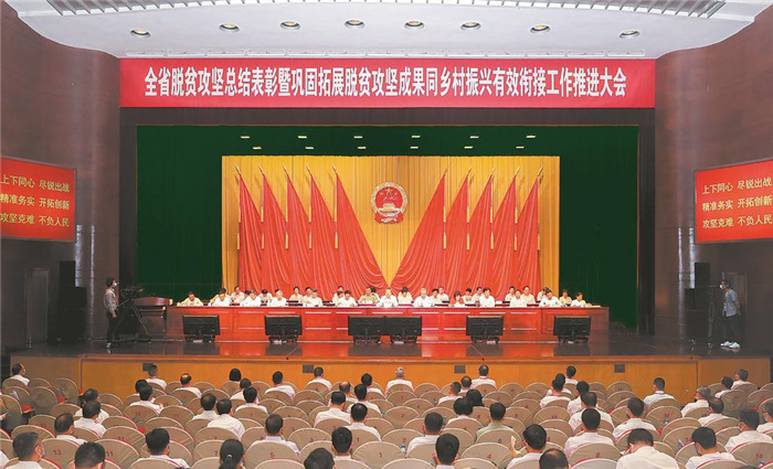會(huì )場(chǎng)內氣氛隆重熱烈。主席臺上方懸掛著(zhù)“全省脫貧攻堅總結表彰暨鞏固拓展脫貧攻堅成果同鄉村振興有效銜接工作推進(jìn)大會(huì )”會(huì )標,后幕正中中華人民共和國國徽熠熠生輝,10面鮮艷的紅旗分列兩側。二樓眺臺懸掛標語(yǔ):“緊密團結在以習近平同志為核心的黨中央周?chē)?鞏固拓展脫貧攻堅成果 全面推進(jìn)鄉村振興 加快建設新階段現代化美好安徽”。