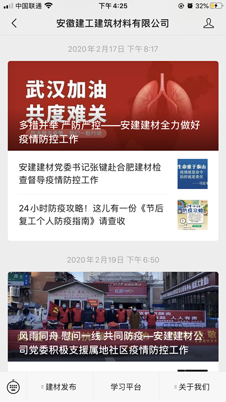 疫情就是命令,防控就是責任。安建建材黨委將認真學(xué)習貫徹落實(shí)習近平總書(shū)記重要講話(huà)精神,妥善應對疫情防控各項工作,統籌有序開(kāi)展復工復產(chǎn),提質(zhì)增效,搶抓機遇,努力把疫情影響降到最低,堅決打贏(yíng)疫情防控阻擊戰,努力實(shí)現全年各項目標任務(wù)。
