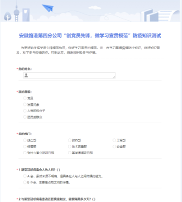 積極引導職工群眾,科學(xué)參與疫情防控。分公司開(kāi)展“創(chuàng )黨員先鋒,做學(xué)習宣貫模范”線(xiàn)上防疫知識答題活動(dòng)。
