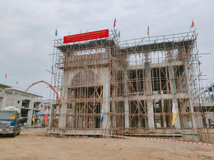阿富汗駐巴使館項目,位于伊斯蘭堡周恩來(lái)大道北側,總建筑面積18834.44平方米,于2018年9月開(kāi)工,項目部全體員工克服現場(chǎng)無(wú)市政用電、施工圖紙不全、高溫炎熱天氣與雨季施工等困難,特別是2020年遭遇新冠疫情,巴基斯坦分公司積極協(xié)調努力,聯(lián)系包機分批接回滯留國內人員,網(wǎng)格化管理屬地用工,在嚴密落實(shí)疫情防控措施的前提下迅速推進(jìn)工程進(jìn)度,終于完成封頂任務(wù)。