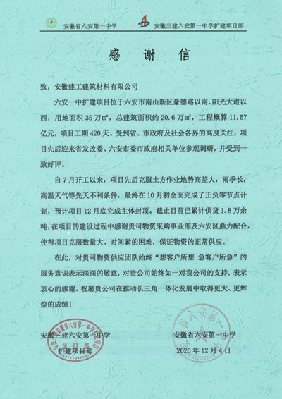 日前,公司收到安徽省六安第一中學(xué)感謝信,信件表達了對安建建材“想客戶(hù)所想,急客戶(hù)所急”高質(zhì)量供應服務(wù)的充分認可,充分肯定了公司的資源整合及保供能力。