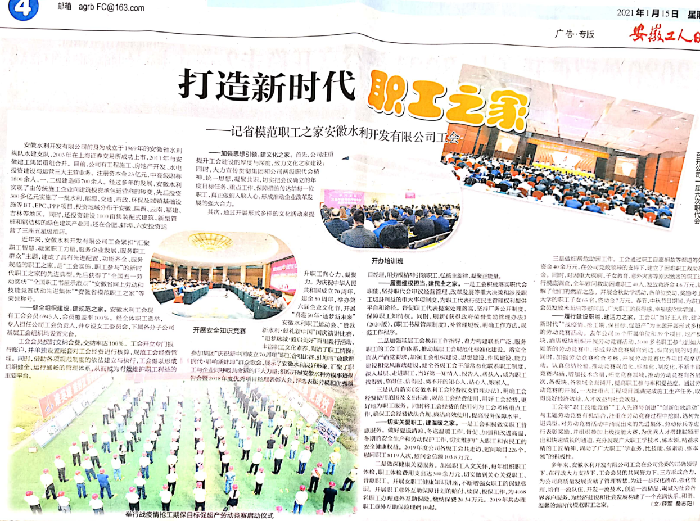 編者按:2021年1月15日,安徽工人日報以《打造新時(shí)代職工之家——記省模范職工之家安徽水利開(kāi)發(fā)有限公司工會(huì )》為題,刊發(fā)了安徽水利工會(huì )獲評安徽省模范職工之家的深度報道,對安徽水利工會(huì )圍繞中心、服務(wù)大局,加強自身建設,推動(dòng)企業(yè)高質(zhì)量發(fā)展等方面的經(jīng)驗做法給予了重點(diǎn)推介。