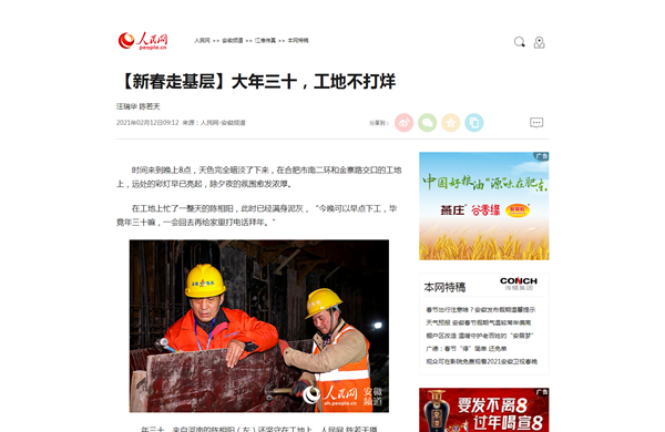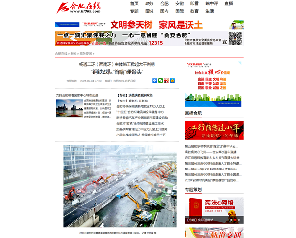 安徽路橋公司承建的暢通二環(huán)(西南環(huán))工程是目前合肥市最重要的市政工程之一。自項目建設以來(lái),備受社會(huì )各界的高度關(guān)注。特別是在春節期間,項目鉚足干勁、大干正酣的諸多場(chǎng)景,得到人民網(wǎng)、中國日報、學(xué)習強國、安徽衛視、中安在線(xiàn)、安徽網(wǎng)、新安晚報、澎湃新聞、合肥日報等眾多媒體的全方位、多角度報道。