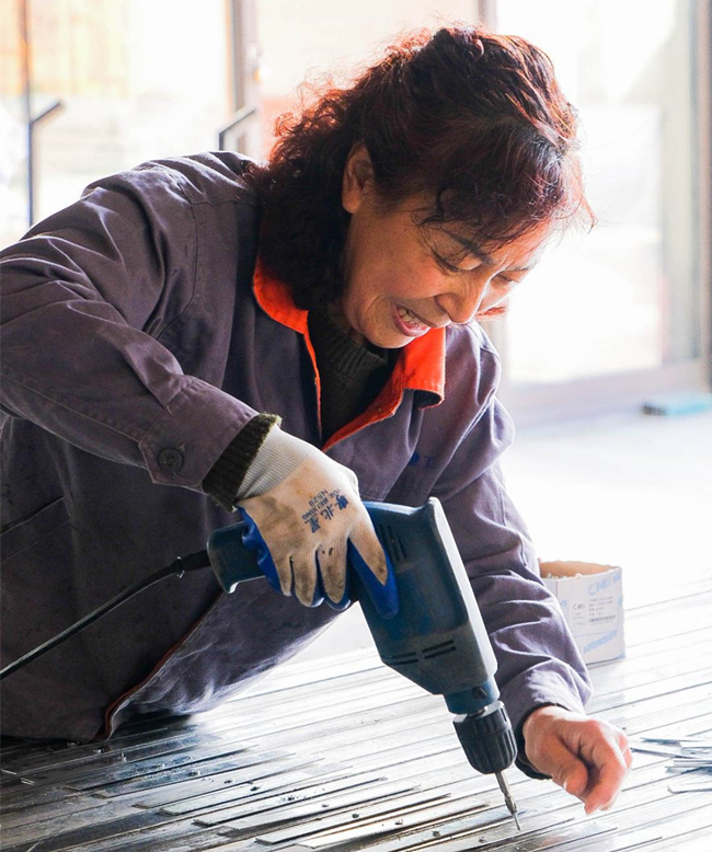 門(mén)窗公司女工王來(lái)菊在車(chē)間工作區域進(jìn)行材料加工工作,為搶門(mén)窗生產(chǎn)進(jìn)度