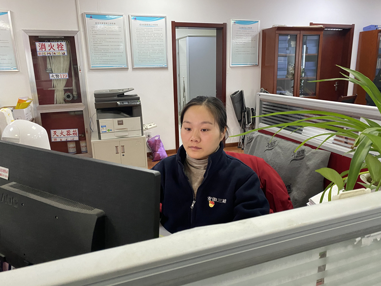 蚌埠公司淮南鼎元世家項目部核算員黃夢(mèng)玲正在分解工程量報招標計劃、整理竣工項目成本資料