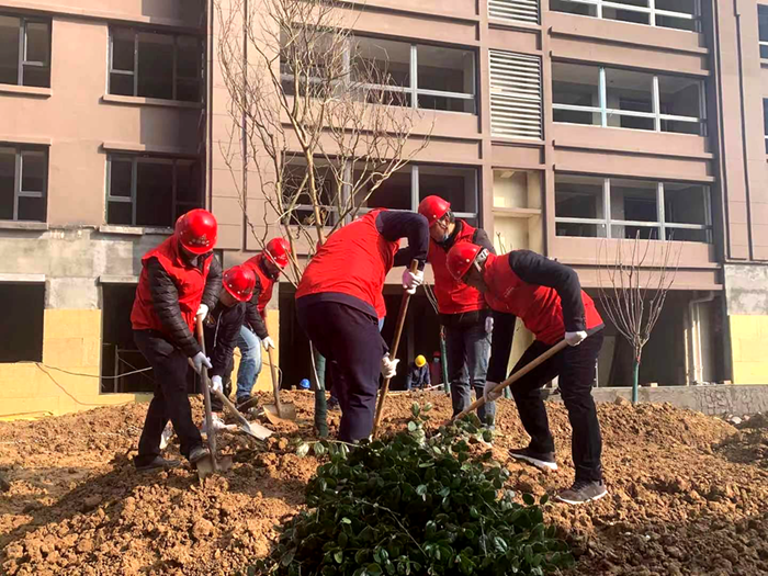 沛縣支部聯(lián)合安徽一建組織開(kāi)展植樹(shù)活動(dòng)。3月12日,團員青年前往安建地產(chǎn)·漢城源筑書(shū)香苑園林景觀(guān)處,分工協(xié)作——搬運樹(shù)苗、挖坑放樹(shù)苗、填土踏實(shí),最后澆水灌溉,小心仔細地為春天增上一抹生機。在大家共同辛勤勞動(dòng)下,書(shū)香苑園林景觀(guān)處裸露的黃土上多了一顆顆小樹(shù)苗,為明媚的春光又增添了一份綠意,更顯生機勃勃。此次活動(dòng)中全體參與人員親手栽種樹(shù)苗,增強了愛(ài)樹(shù)護樹(shù)的意識,強化保護環(huán)境、愛(ài)護家園的環(huán)保觀(guān)念。