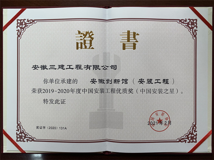 4月22日,中國安裝協(xié)會(huì )第七屆二次理事(擴大)會(huì )議暨工程創(chuàng )優(yōu)經(jīng)驗交流會(huì )在濟南召開(kāi)。會(huì )議對2019-2020年度中國安裝工程優(yōu)質(zhì)獎(中國安裝之星)獲獎單位進(jìn)行表彰并頒發(fā)獎杯和榮譽(yù)證書(shū);安徽三建合肥市二院新區內科病房大樓項目及安徽創(chuàng )新館項目(安裝工程)獲此殊榮。該獎項獲得充分說(shuō)明了安徽三建安裝施工水平。