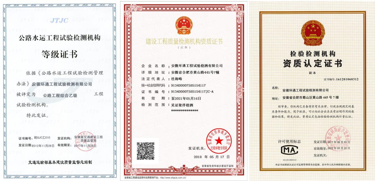 理念成就發(fā)展,堅守鑄就跨越。環(huán)通公司堅持一本藍圖繪到底,從無(wú)到有,從弱到強,走過(guò)了14年的創(chuàng )業(yè)之路。新時(shí)期,隨著(zhù)全國交通建設領(lǐng)域的大建設大發(fā)展,環(huán)通公司依托安徽建工集團品牌優(yōu)勢,精準定位,搶抓發(fā)展機遇,加快轉型升級步伐,實(shí)現了高質(zhì)量、可持續發(fā)展,已經(jīng)成為專(zhuān)業(yè)化從事公路、橋梁、市政、軌道交通、電力等領(lǐng)域技術(shù)服務(wù)的綜合性試驗檢測單位,擁有交通部綜合乙級公路工程試驗資質(zhì)、計量認證資質(zhì)和省建設廳見(jiàn)證取樣資質(zhì)。