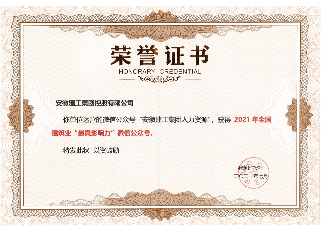 “安徽建工集團人力資源”微信公眾號榮登“2021年全國建筑業(yè)最具影響力公眾號”榜單
