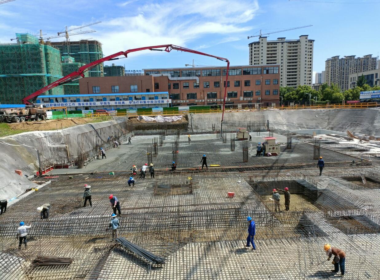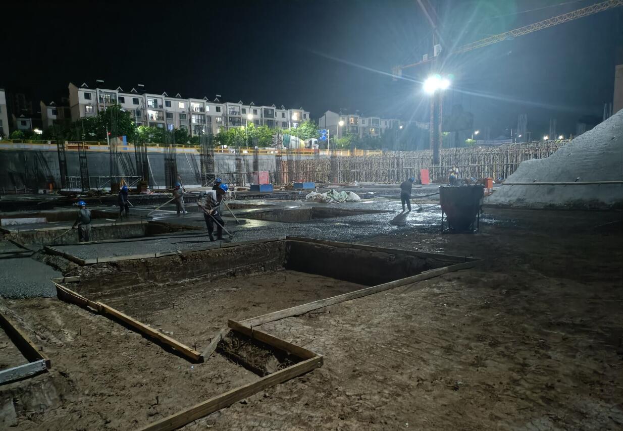 9月23日,人防區C區伐板基礎中午12:00開(kāi)始澆筑。為確?;炷翝仓|(zhì)量,項目部選定2條快速運輸路線(xiàn)和1條備用路線(xiàn),調用20臺混凝土罐車(chē)不間斷運輸。項目職工自發(fā)全部堅守崗位,晝夜鏖戰,全天候對現場(chǎng)混凝土和易性、澆筑、振搗等進(jìn)行監控。項目班子全員靠前指揮,過(guò)程中妥善協(xié)調解決工程施工擾民問(wèn)題。經(jīng)過(guò)長(cháng)達13個(gè)小時(shí)的奮戰,于第二日凌晨1:00最終完成筏板基礎現場(chǎng)混凝土的連續澆筑,比原計劃提前了近3小時(shí)完成。