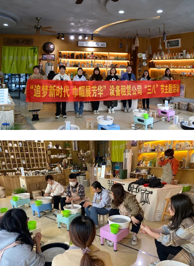 設備租賃公司組織女職工開(kāi)展“追夢(mèng)新時(shí)代,巾幗綻芳華”陶藝體驗創(chuàng )作活動(dòng)。陶藝老師帶著(zhù)女職工們參觀(guān)了工作室中的陶藝工藝品,介紹陶藝發(fā)展文化和制作過(guò)程。在老師的指導和幫助下,女職工們利用專(zhuān)業(yè)的拉胚機和定型工具,大膽發(fā)揮想象對泥料進(jìn)行藝術(shù)創(chuàng )造,制作出了一件件別具匠心的陶瓷工藝品。