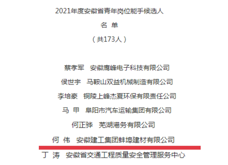 近日,共青團安徽省委傳來(lái)喜訊,安徽建工建材科技集團有限公司職工何偉被授予“2021年度安徽省青年崗位能手”榮譽(yù)稱(chēng)號。