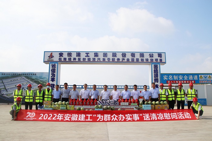 7月18日上午,建工股份黨委副書(shū)記、總經(jīng)理、董事李有貴到安建總承包承建的樅陽(yáng)新能源汽車(chē)零部件產(chǎn)業(yè)園基礎設施建設EPC項目開(kāi)展建工控股第一次黨代會(huì )精神宣講暨“送清涼”活動(dòng)。
