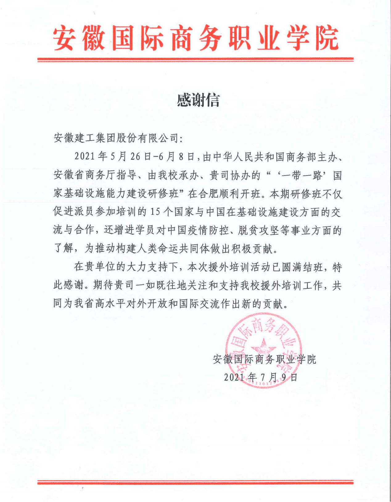 7月9日,安徽集團股份有限公司海外事業(yè)部收到安徽國際商務(wù)職業(yè)學(xué)院來(lái)信,對集團在2021年度“一帶一路”國家基礎設施能力建設研修班舉辦過(guò)程中給予的大力支持表示感謝。