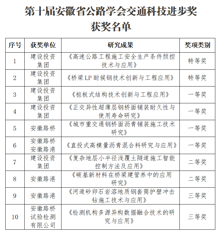 喜訊!集團10項研究成果榮獲安徽省交通科技進(jìn)步獎