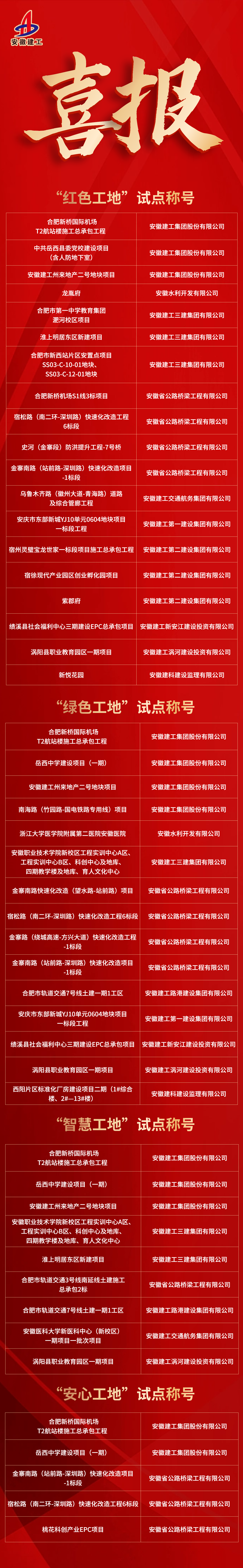 近日,安徽省住房和城鄉建設廳公布了2023年第一批“四個(gè)工地”試點(diǎn)項目名單,安徽建工集團48個(gè)項目上榜,“紅色工地”試點(diǎn)項目19個(gè)、“綠色工地”試點(diǎn)項目15個(gè)、“智慧工地”試點(diǎn)項目9個(gè)、“安心工地”試點(diǎn)項目5個(gè)。