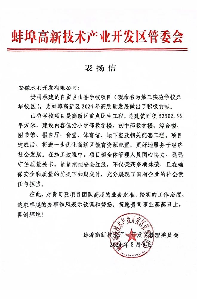 近日,安徽水利山香學(xué)校項目獲蚌埠高新區管委會(huì )來(lái)信表?yè)P,對項目團隊在建設過(guò)程中付出的努力和取得的成績(jì)給予高度評價(jià)。