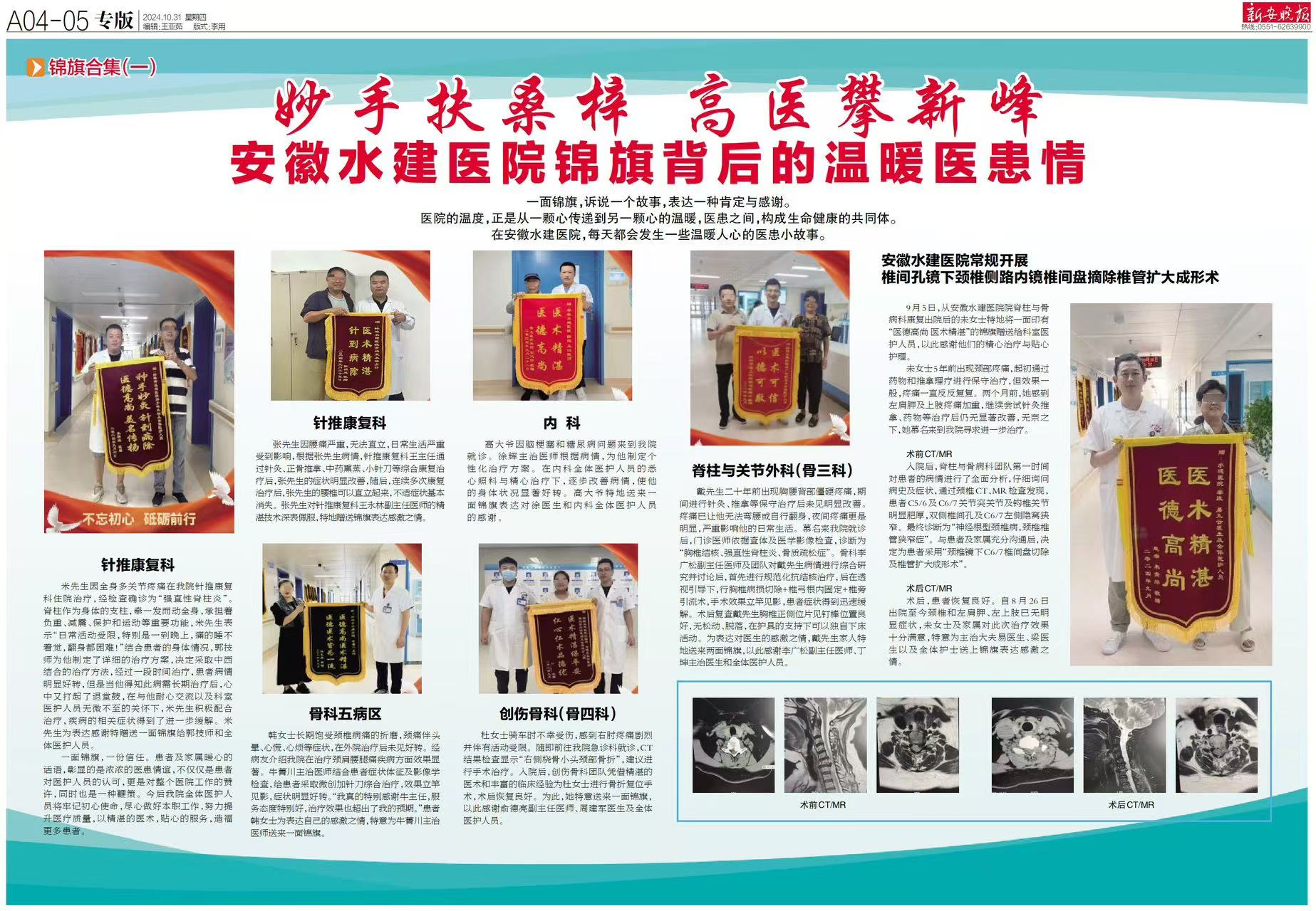 10月31日,新安晚報刊登了水建醫院《妙手扶桑梓 高醫攀新峰》專(zhuān)題報道,文章圍繞錦旗背后的溫暖醫患情進(jìn)行了深情講述。