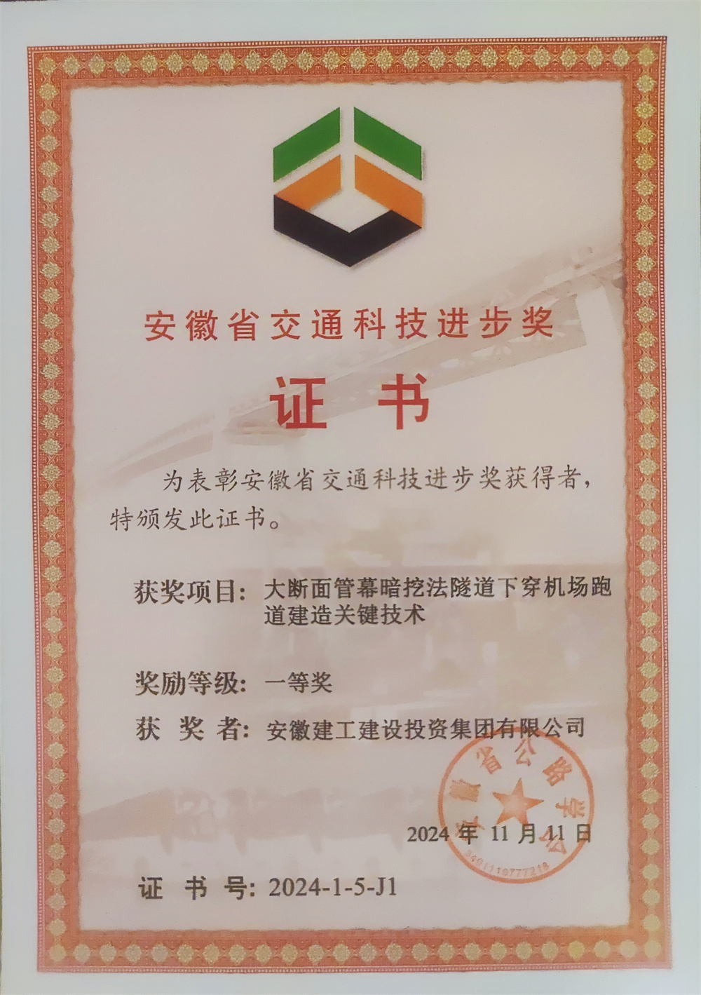 安徽建工建設投資集團申報的5項研究成果獲獎,其中《大斷面管幕暗挖法隧道下穿機場(chǎng)跑道建造關(guān)鍵技術(shù)》榮獲一等獎;建工建投集團被授予2023-2024年度先進(jìn)會(huì )員單位;安徽省公路學(xué)會(huì )橋隧專(zhuān)委會(huì )被授予2023-2024年度先進(jìn)學(xué)會(huì )和分支機構稱(chēng)號。公司黨委委員、副總經(jīng)理、總工程師陳莘作為獲獎單位代表上臺領(lǐng)獎。