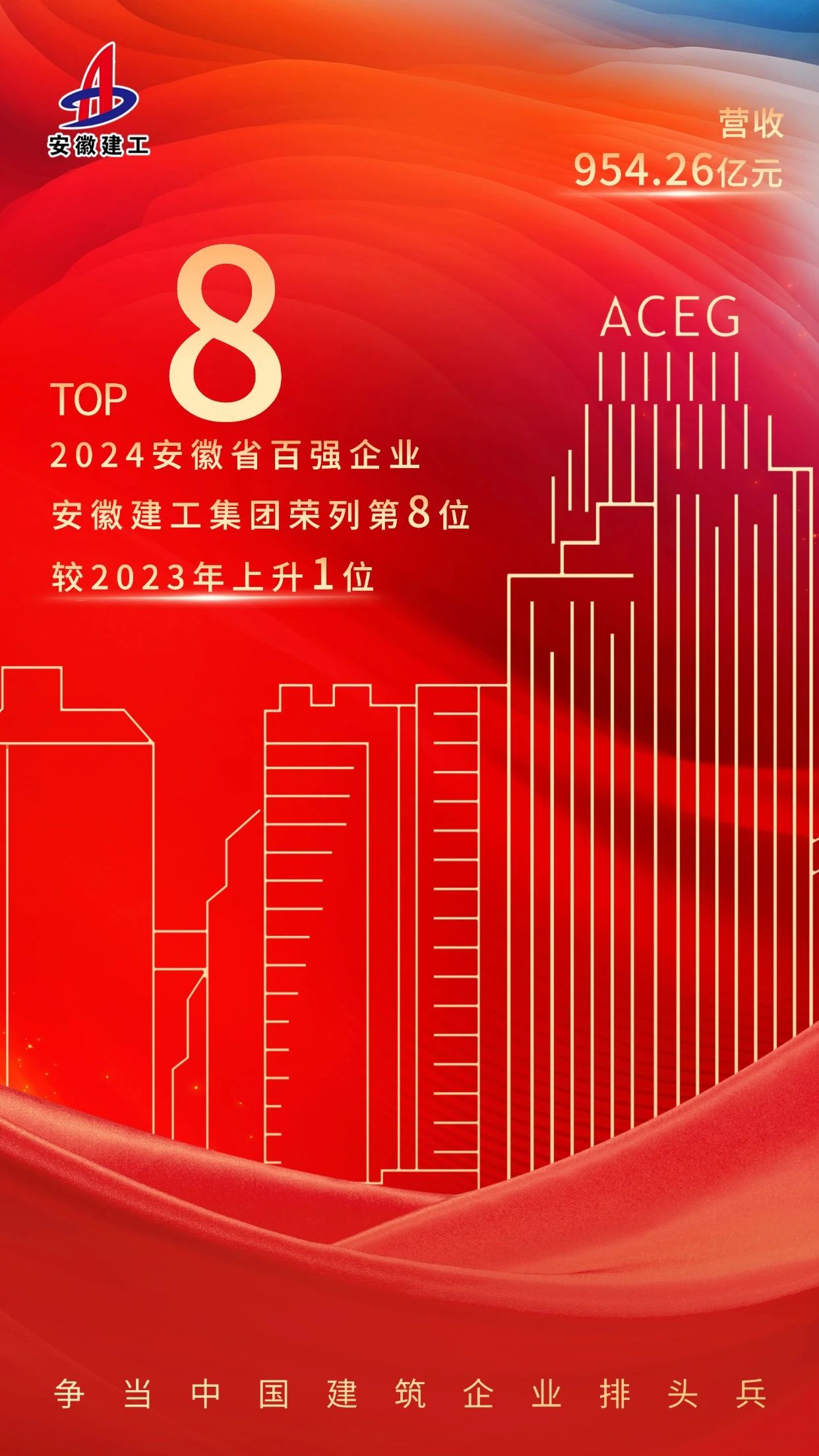 11月23日,安徽省企業(yè)聯(lián)合會(huì )、企業(yè)家聯(lián)合會(huì )發(fā)布“2024安徽省百強企業(yè)榜單”,安徽建工集團控股有限公司以營(yíng)業(yè)收入954.26億元的成績(jì)榮列“2024安徽省百強企業(yè)”榜單第8位,較2023年上升一位。