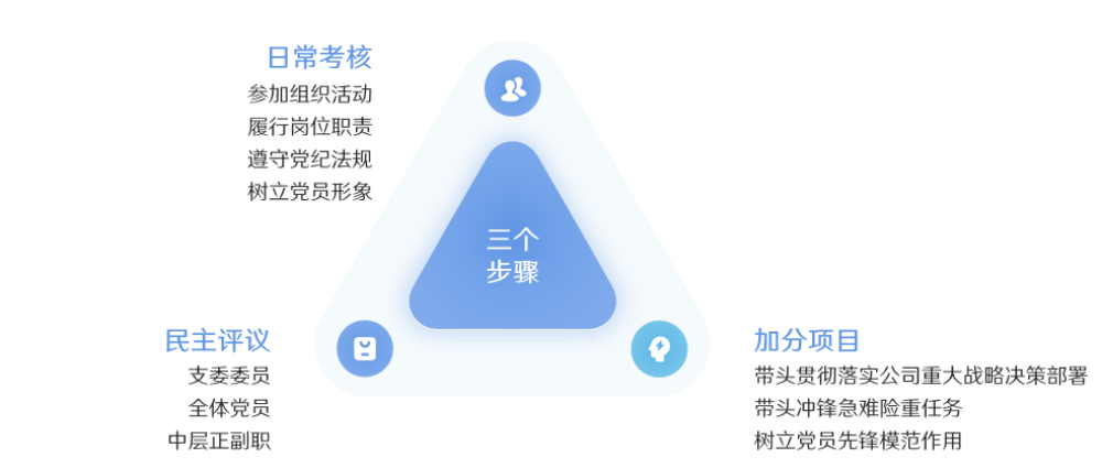 遵循“實(shí)事求是、立足崗位、獎優(yōu)罰劣、民主公開(kāi)”的原則,設置日??己?、民主評議和加分項目三個(gè)部分,對黨員綜合表現進(jìn)行客觀(guān)評價(jià)。其中,日??己司劢箙⒓咏M織活動(dòng)、履行崗位職責、遵守黨紀法規、樹(shù)立黨員形象四個(gè)主要方面,設置扣分項目,對黨員履行基本義務(wù)提出明確要求。加分項目重在激勵黨員干部帶頭貫徹落實(shí)公司重大戰略決策部署、帶頭沖鋒急難險重任務(wù),樹(shù)立黨員先鋒模范作用。