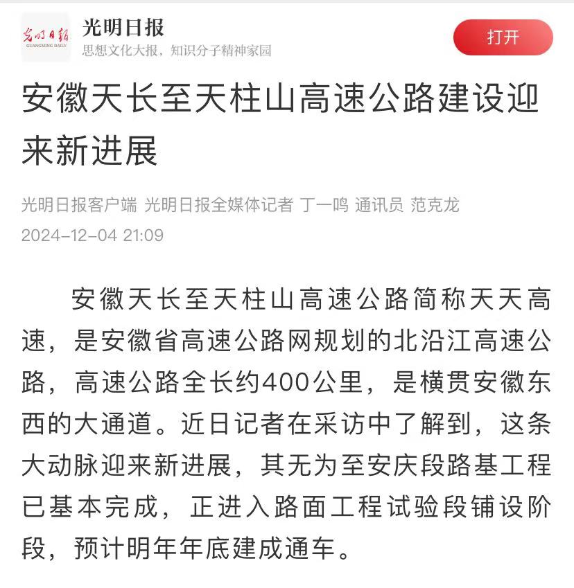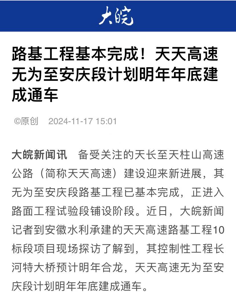 近日,安徽水利天長(cháng)至天柱山高速公路無(wú)為至安慶段路基工程已基本完成,正進(jìn)入路面工程試驗段鋪設階段,預計明年年底將建成通車(chē),受到光明日報、安徽日報、中安在線(xiàn)、大皖新聞等主流媒體關(guān)注報道。
