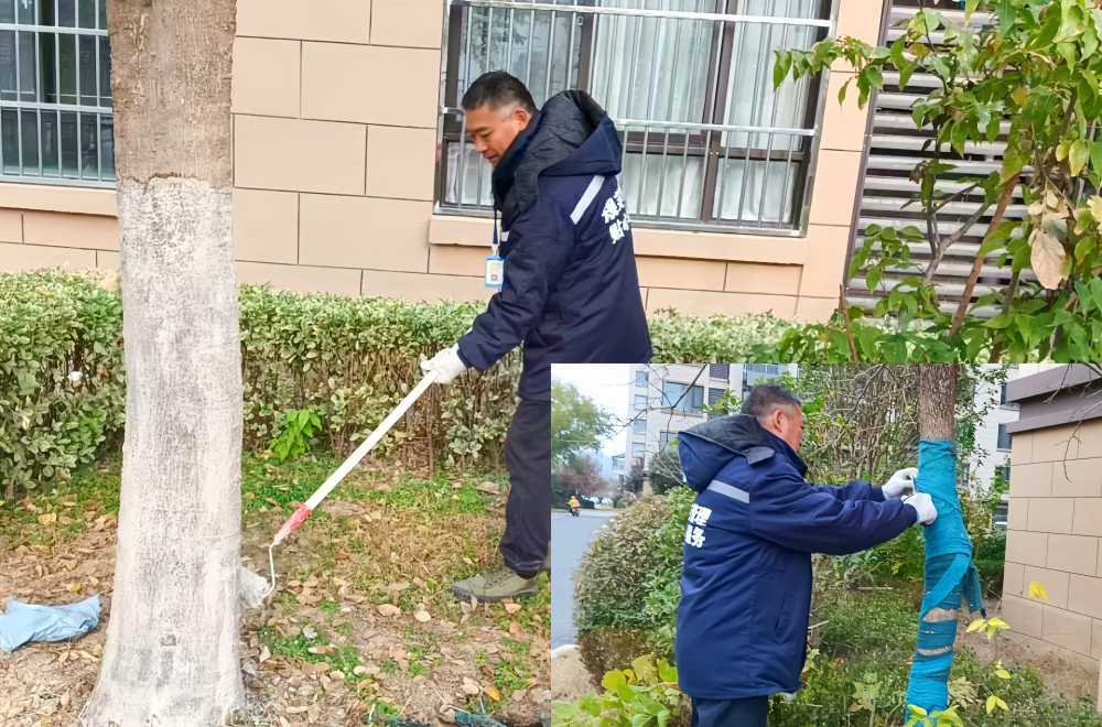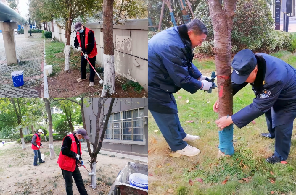 霜凍、寒潮如冷酷殺手,威脅著(zhù)綠化植物的健康與景觀(guān)效果。物業(yè)公司綠化師傅們妙招頻出,在精心落實(shí)日??茖W(xué)養護之余,對新植或不耐寒樹(shù)木重點(diǎn)呵護,逐一為樹(shù)干刷上潔白防護漆,宛如給樹(shù)木穿上“防護服”;部分嬌弱植株則裹上防寒布,變身冬日“暖寶寶”,靜靜守護,只待來(lái)年春歸時(shí),重煥滿(mǎn)園蔥郁。