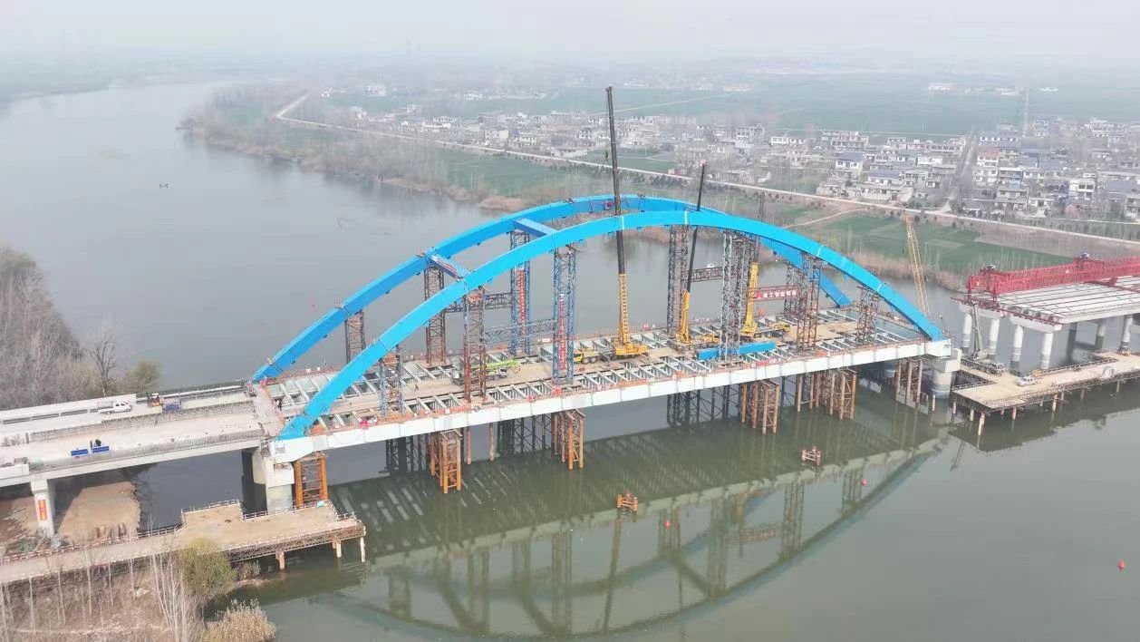 渦河一號大橋主橋為145米下承式鋼箱系桿拱橋,橫跨渦河,主橋鋼梁由兩邊箱主縱梁與預制凝土橋面板及橫梁組成,系梁采用200t架橋機進(jìn)行架設,主橋鋼拱肋采用全焊接,由兩臺300t汽車(chē)吊互相配合協(xié)助吊裝,隨著(zhù)重達40t的最后一片鋼拱肋嵌入預定位置,與已架設部分嚴絲合縫,渦河兩岸實(shí)現“無(wú)縫牽手”。
