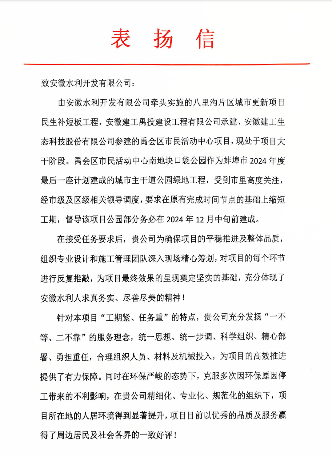 12月23日,安徽水利八里溝片區城市更新項目民生補短板工程禹會(huì )區市民活動(dòng)中心項目獲業(yè)主來(lái)信表?yè)P。