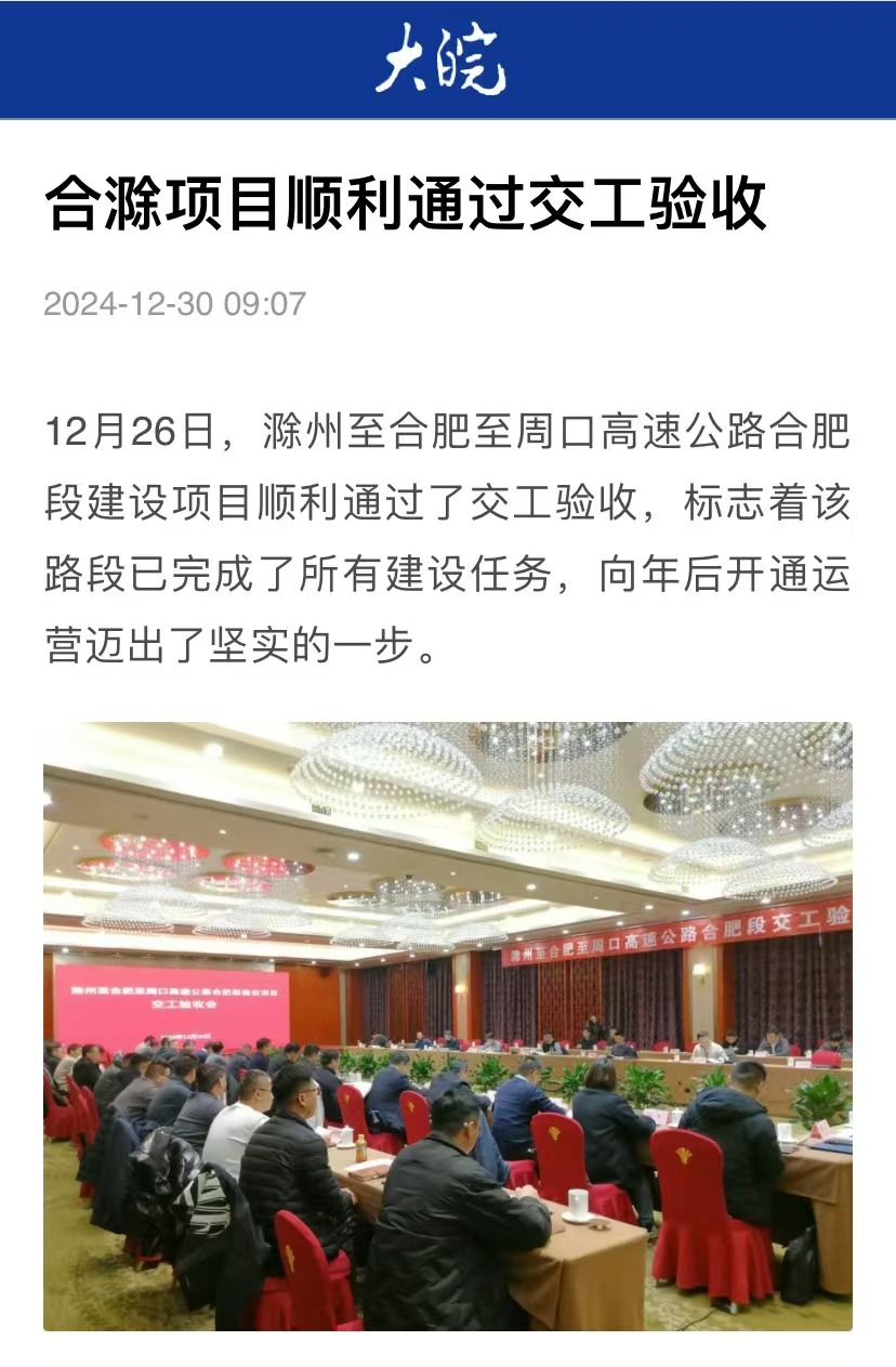 近日,安徽水利滁州至合肥至周口高速公路合肥段建設項目順利通過(guò)交工驗收,標志著(zhù)該路段已完成了所有建設任務(wù),向年后開(kāi)通運營(yíng)邁出了堅實(shí)一步,受到大皖新聞等媒體關(guān)注報道。