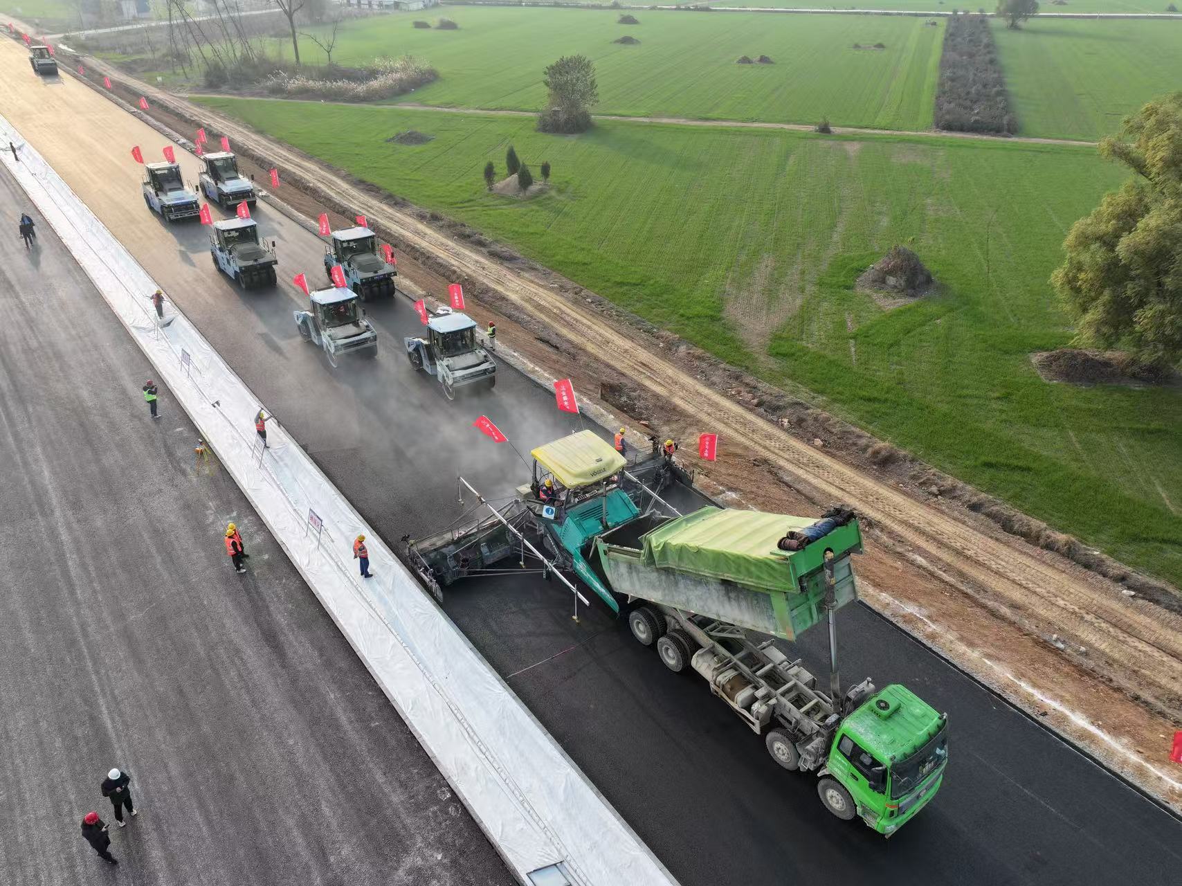 徐淮阜項目建設一路高歌猛進(jìn),當下已成功邁入關(guān)鍵的瀝青上面層施工階段。大型攤鋪機穩步推進(jìn),鏗鏘有力地將溫度高達 150℃的優(yōu)質(zhì)瀝青均勻鋪展,為道路編織堅實(shí)的“外衣”。在全體建設者爭分奪秒的奮戰下,項目正朝著(zhù) 2025 年 5 月全面竣工的目標全力沖刺。