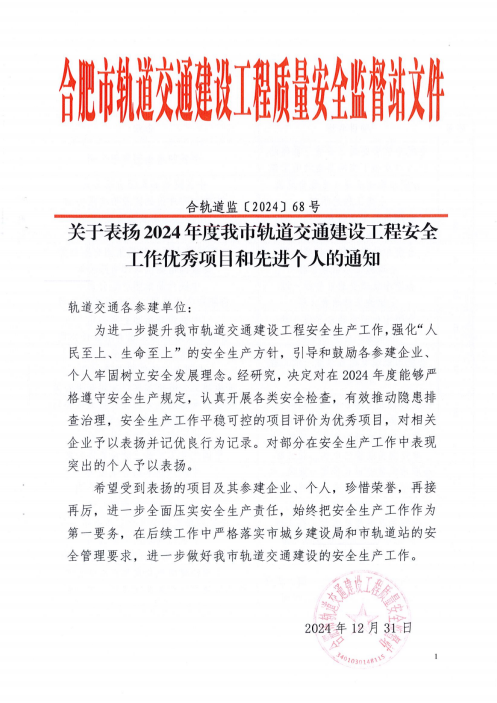 近日,建工路港軌道交通7號線(xiàn)項目榮獲2024年度合肥市軌道交通建設工程“安全工作優(yōu)秀項目”稱(chēng)號,項目經(jīng)理被授予“安全工作先進(jìn)個(gè)人”稱(chēng)號。