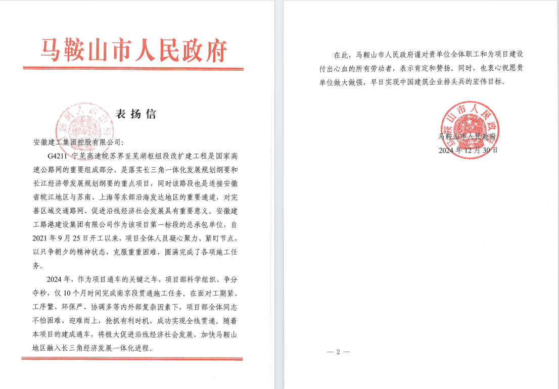 2024年12月30日,項目部收到了來(lái)自馬鞍山市人民政府的表?yè)P信,表?yè)P信中對安徽建工集團及安徽建工路港建設集團有限公司全體職工和為項目建設付出心血的所有勞動(dòng)者表示了肯定和贊揚。這是對項目團隊辛勤付出的最大的肯定,也是對他們專(zhuān)業(yè)精神和敬業(yè)態(tài)度的高度認可。這份表?yè)P信不僅是一份榮譽(yù),更是一種激勵。這份表?yè)P信的背后,是項目團隊無(wú)數個(gè)日夜的堅守和付出,為當地經(jīng)濟社會(huì )發(fā)展做出重要貢獻,也為集團、公司在今后的項目建設中積累了寶貴的經(jīng)驗,樹(shù)立了良好的品牌形象。