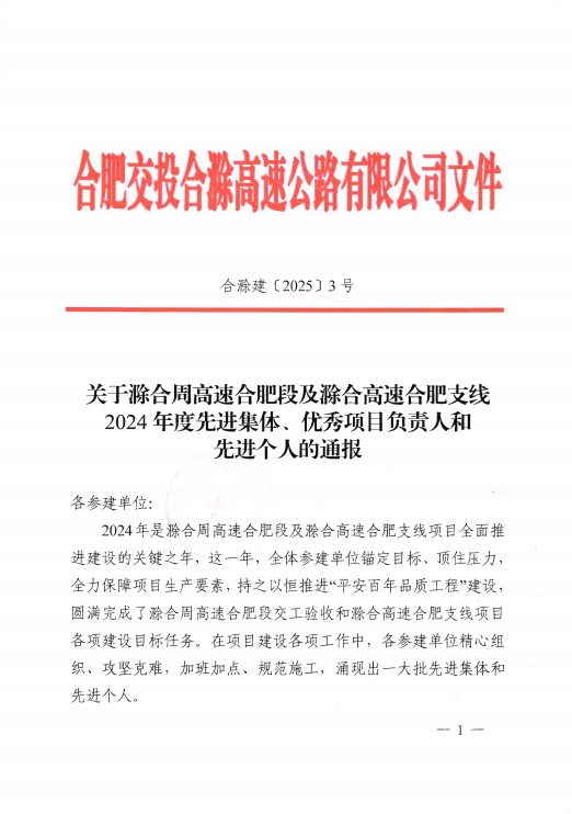 近日,合肥交投合滁高速公路舉辦2024年度總結大會(huì )暨表彰大會(huì )。滁合支線(xiàn)項目榮獲2024年度“先進(jìn)集體”稱(chēng)號,徐海東同志榮獲“優(yōu)秀項目負責人”稱(chēng)號,張興強、王盛楠、耿貝貝同志榮獲先進(jìn)個(gè)人稱(chēng)號。